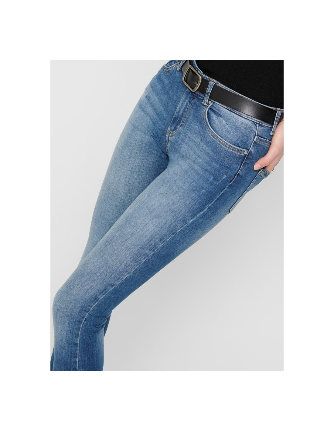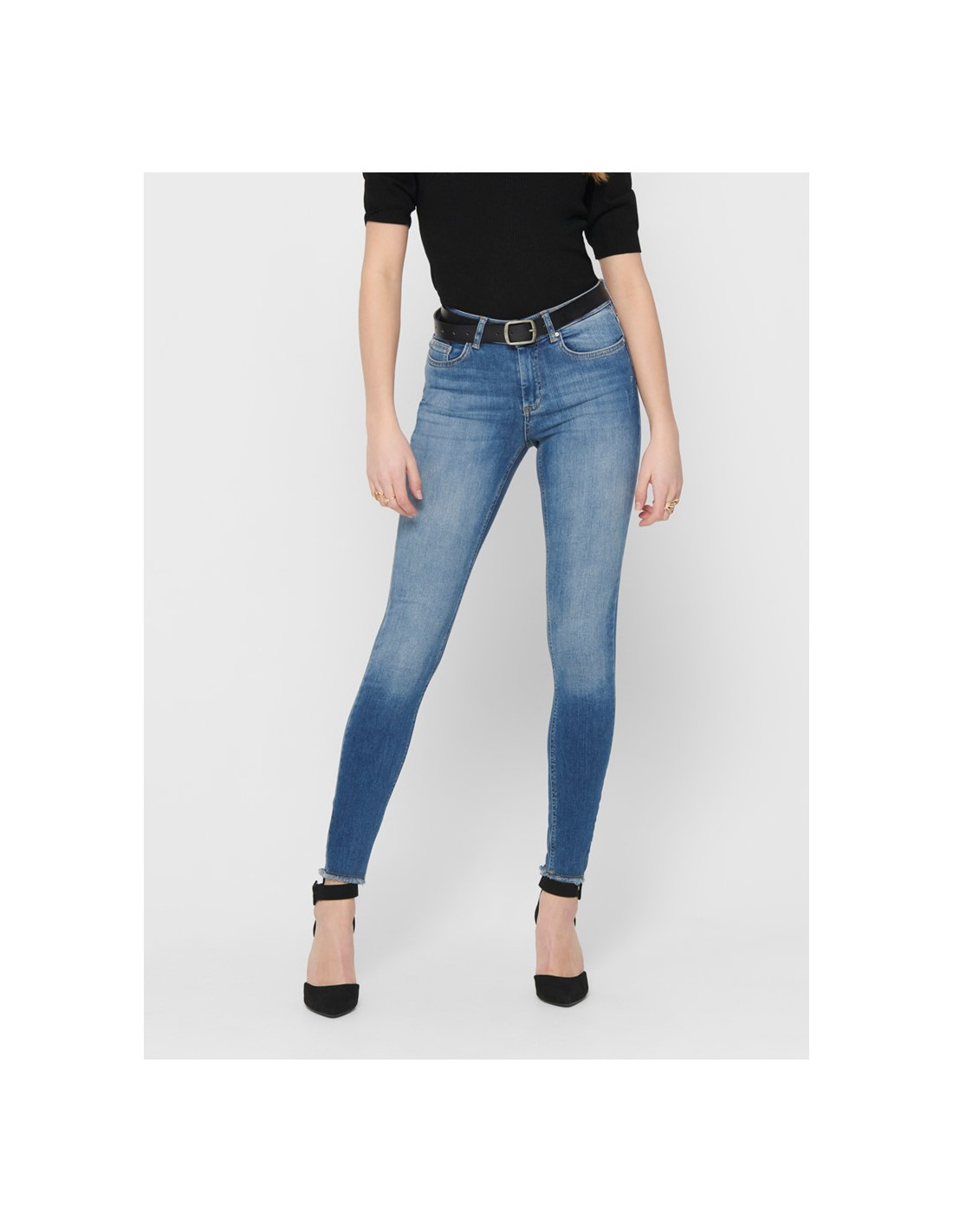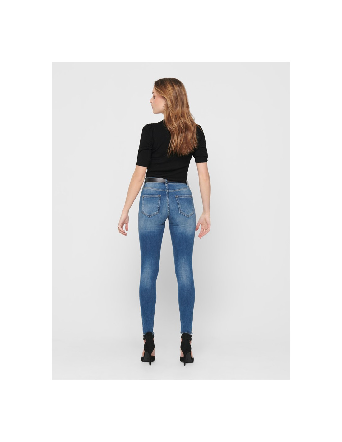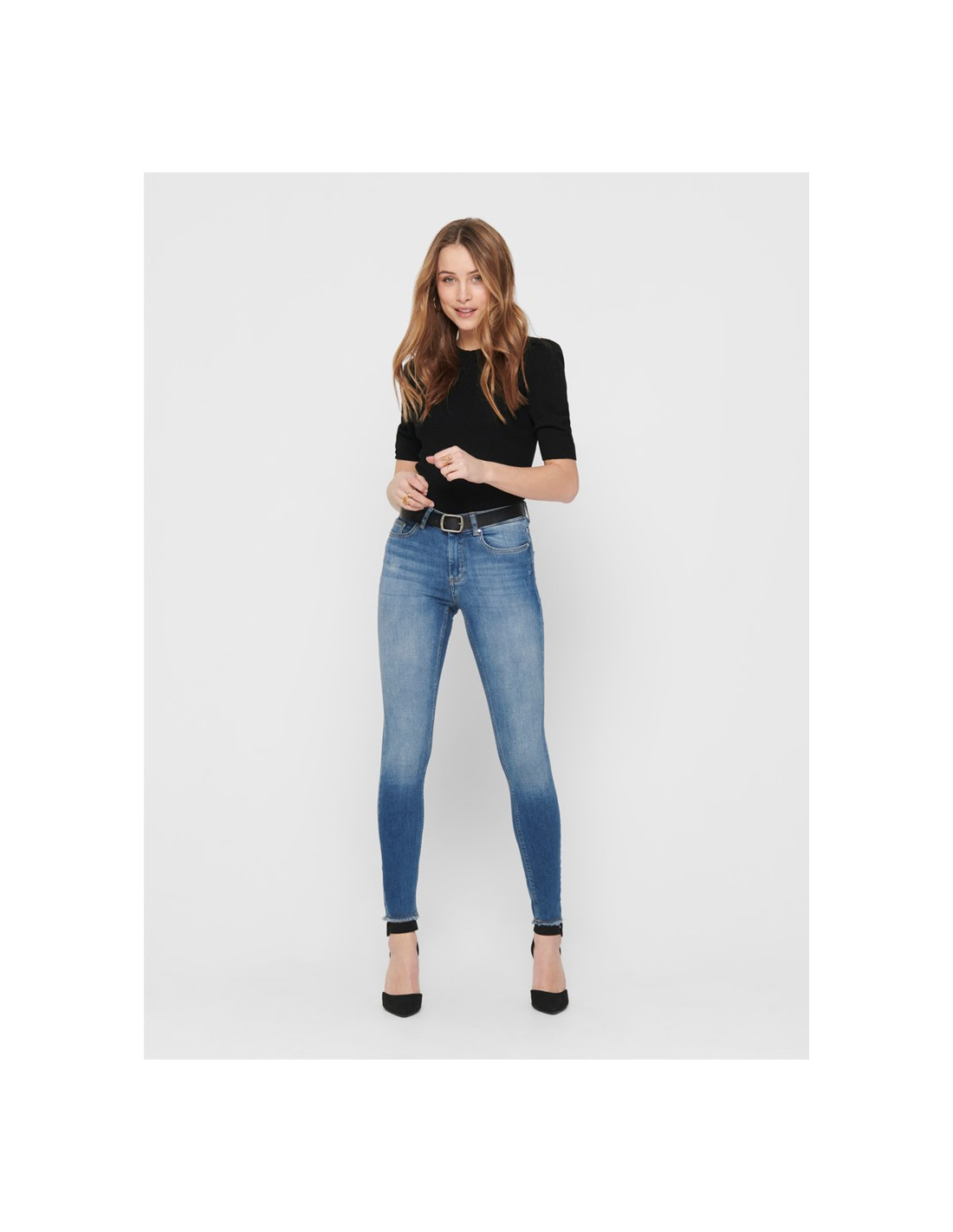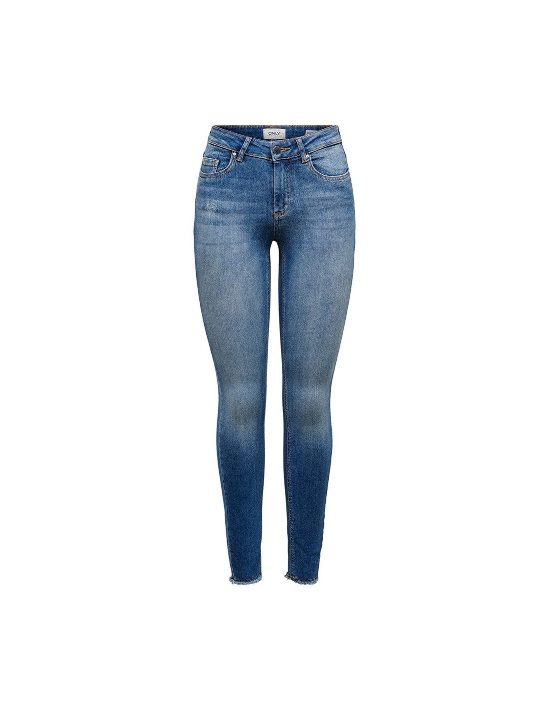 - Skinny ankle jeans - Normal waist - Raw edges below at each leg - Closure at front - 5 belt loops - 2 front pockets and a coin pocket - 2 back pockets - Stretchy material - Inseam: 75 cm in size M/34 - The model is wearing size S/32